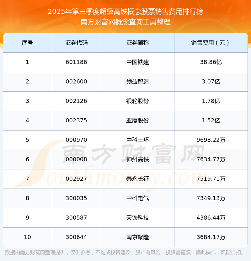 2025年第三季度超级高铁概念股票销售费用排行榜如下:中国铁建(601186)的销售费用总额高达38.86亿,领益智造(002600)和银轮股份(002126)分别位居第二和第三,亚厦股份(002375)、中科三环(000970)、神州高铁(000008)、泰永长征(002927)、中科电气(300035)、天铁科技(300587)、南京聚隆(300644)分别进入前十,其销售费用总额分别排名第4-10名。