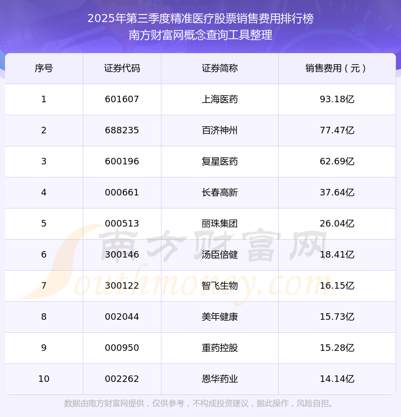 2025年第三季度,精准医疗股票销售费用排行榜如下:上海医药(601607)的销售费用总额高达93.18亿,百济神州(688235)和复星医药(600196)分别位居第二和第三,长春高新(000661)、丽珠集团(000513)、汤臣倍健(300146)、智飞生物(300122)、美年健康(002044)、重药控股(000950)、恩华药业(002262)分别进入前十,其销售费用总额分别排名第4-10名。