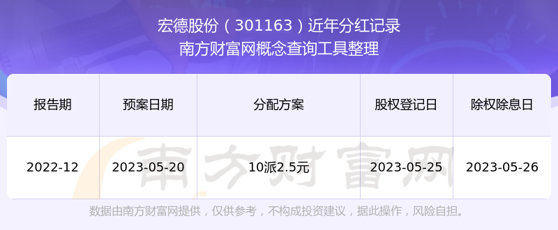 宏德股份最新一次公布的分红方案为10派2.5元。本次权益分派股权登记日为2023年5月25日,除权除息日为2023年5月26日,派息日为2023年5月26日。