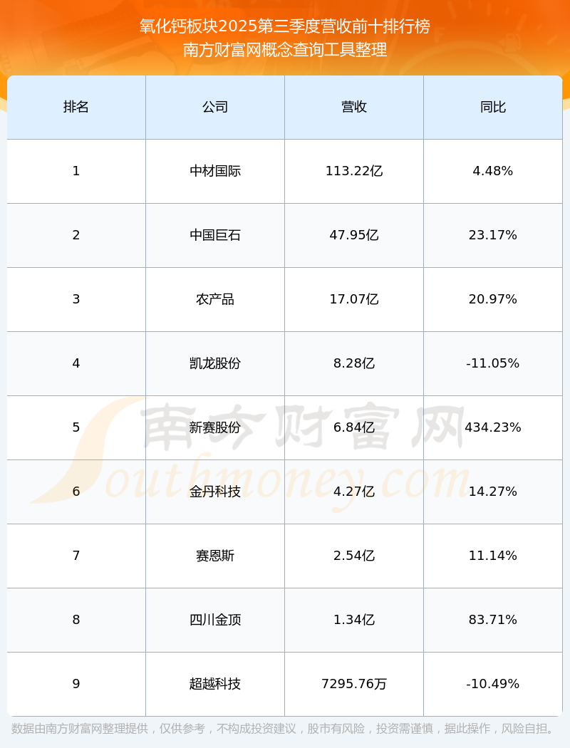 按照南方财富网概念查询工具统计,该股所属板块为氧化钙板块,该板块共有9只股票,四川金顶2025第三季度营收在该板块中排名为第8名,该板块2025第三季度营收排名前十的股票如下表: