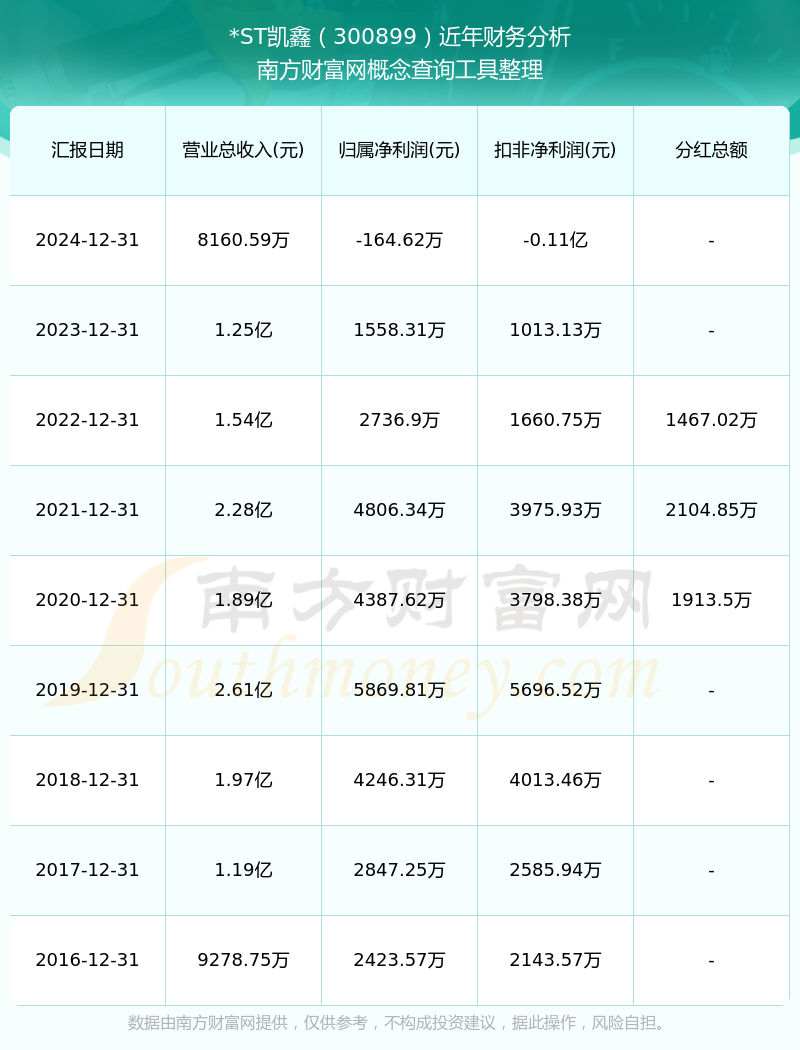 *ST凯鑫2024年总营收8160.59万,同比增长-34.52%;净利润-164.62万,同比增长-110.56%;销售毛利率23.47%。