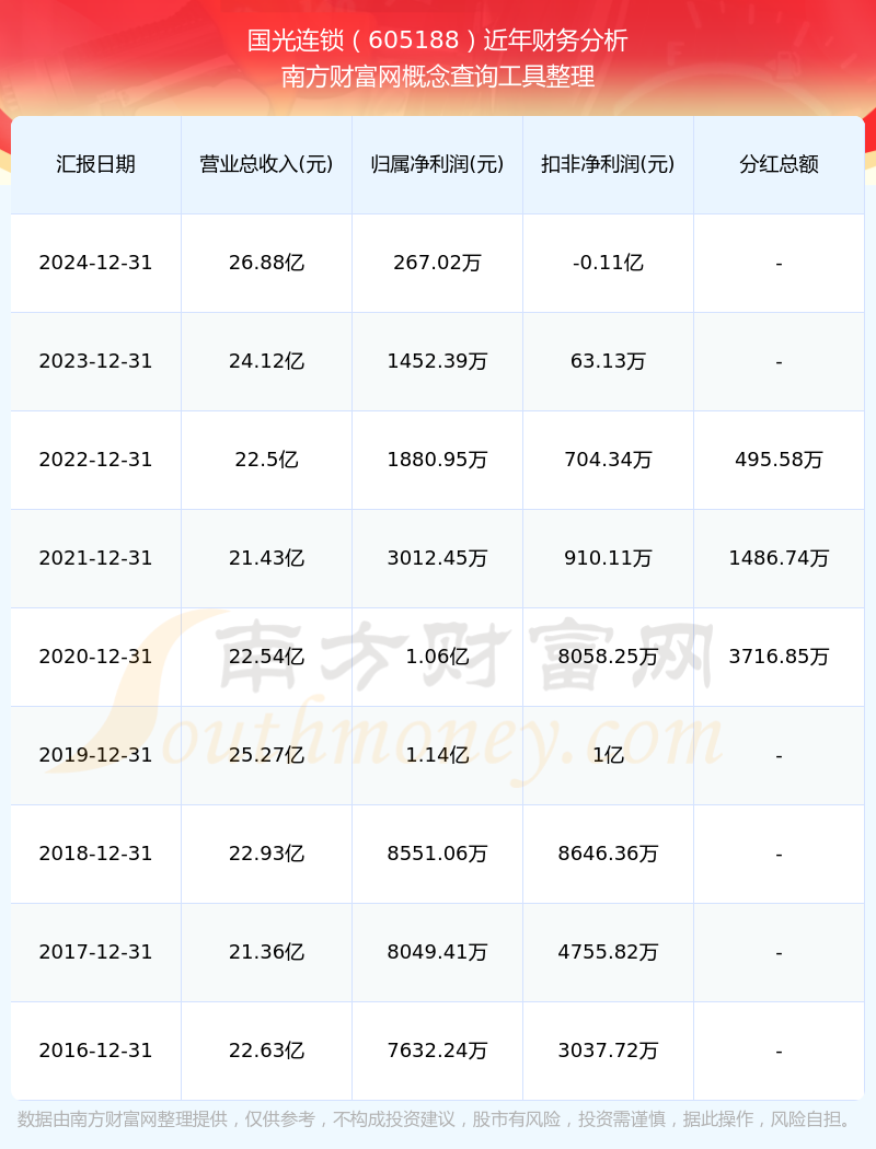 国光连锁公司2024年实现营业收入26.88亿元,同比增长11.43%;净利润267.02万元,同比增长-81.62%;毛利率22.28%。