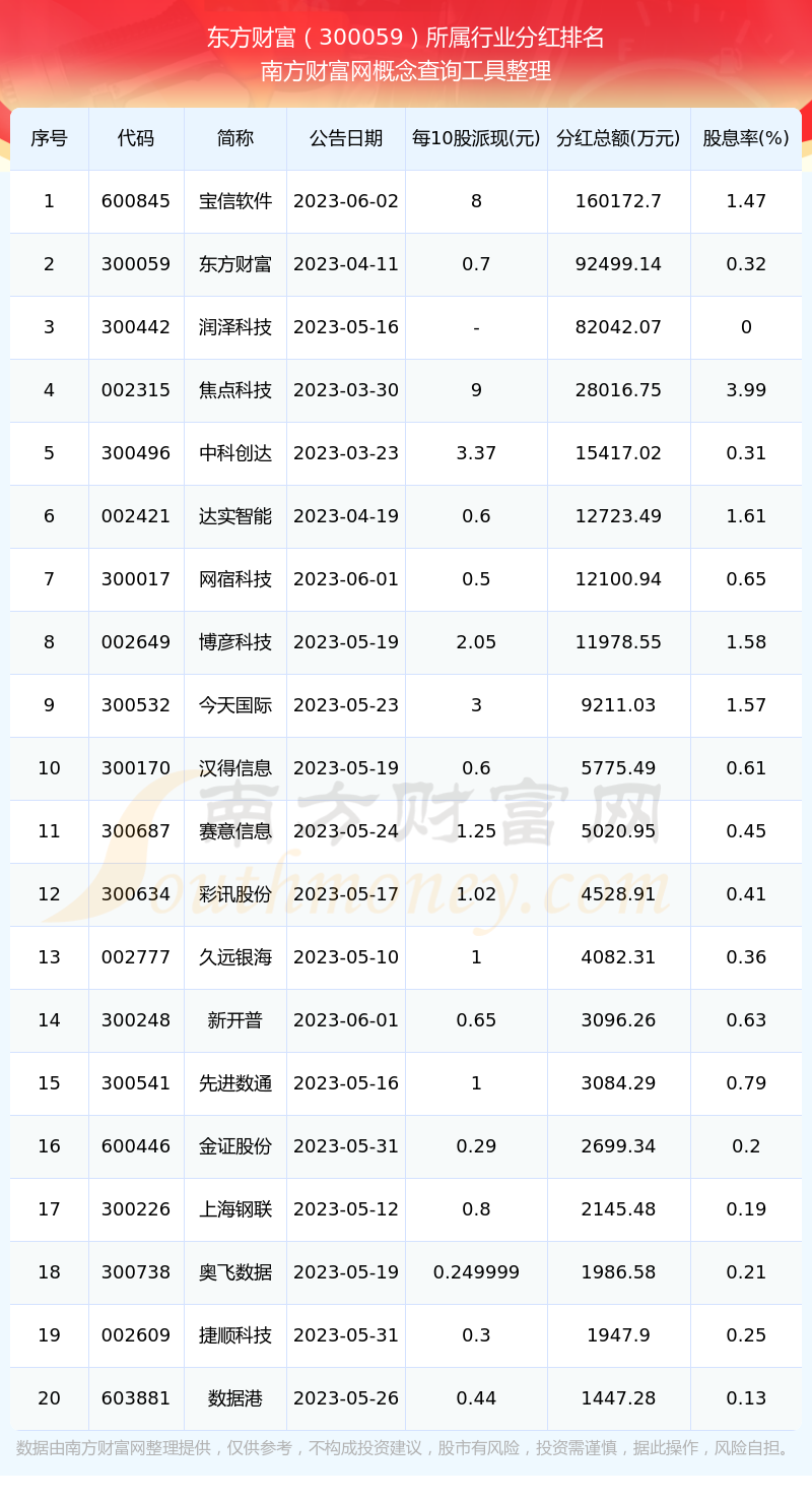 按照南方财富网趋势选股系统统计,东方财富所属行业为互联网服务行业,互联网服务行业分红排名情况如下表: