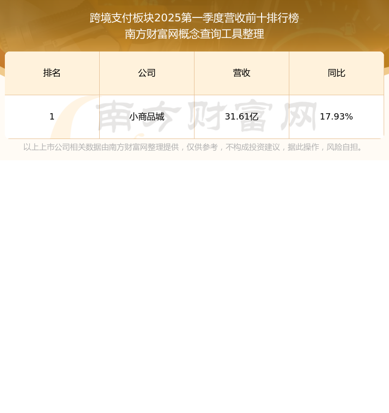 按照南方财富网概念查询工具统计,该股所属板块为跨境支付板块,该板块共有1只股票,农业银行2025第一季度营收在该板块中排名为第1名,该板块2025第一季度营收排名前十的股票如下表: