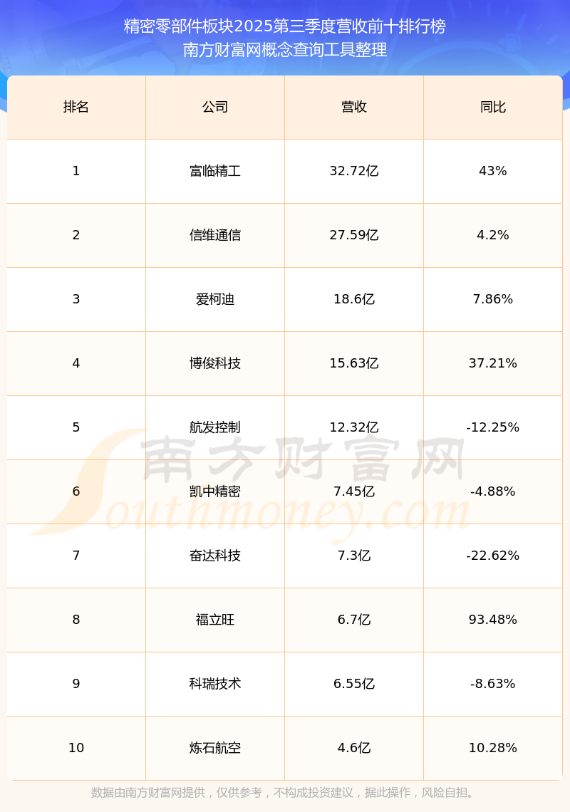 按照南方财富网概念查询工具统计,该股所属板块为精密零部件板块,该板块共有21只股票,福立旺2025第三季度营收在该板块中排名为第8名,该板块2025第三季度营收排名前十的股票如下表: