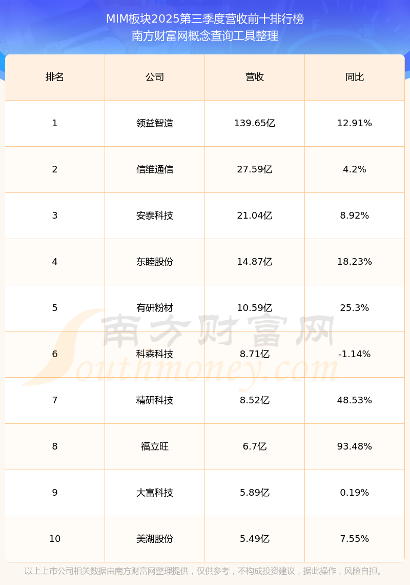 按照南方财富网概念查询工具统计,该股所属板块为MIM板块,该板块共有20只股票,统联精密2025第三季度营收在该板块中排名为第15名,该板块2025第三季度营收排名前十的股票如下表: