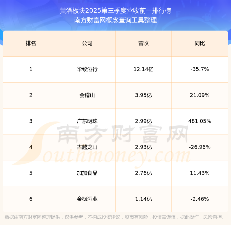 按照南方财富网概念查询工具统计,该股所属板块为黄酒板块,该板块共有6只股票,金枫酒业2025第三季度营收在该板块中排名为第6名,该板块2025第三季度营收排名前十的股票如下表: