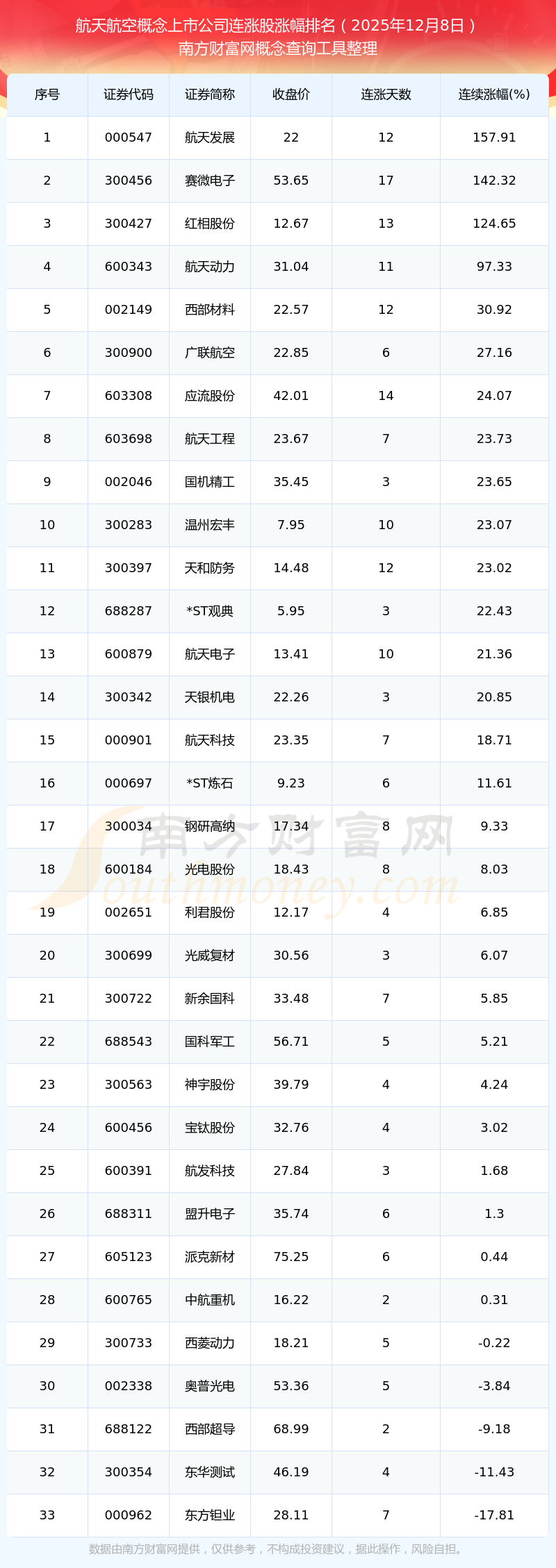 根据南方财富网概念查询工具数据统计,截止2025年12月8日收盘,航天航空概念上市公司共有33只个股实现连涨。其中连续涨幅较大的个股有航天发展、赛微电子、红相股份等,连续涨幅分别为157.91%、142.32%、124.65%。