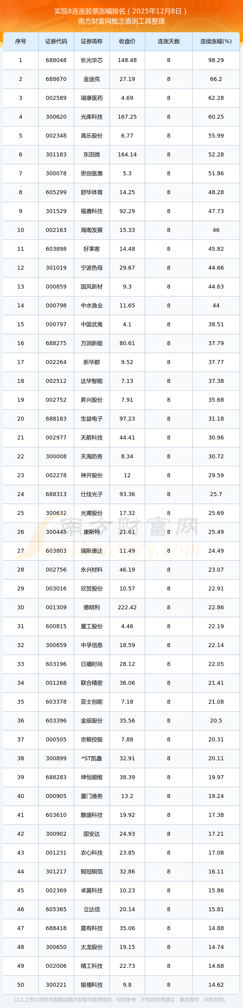 2025年12月8日实现8连涨股票涨幅排名