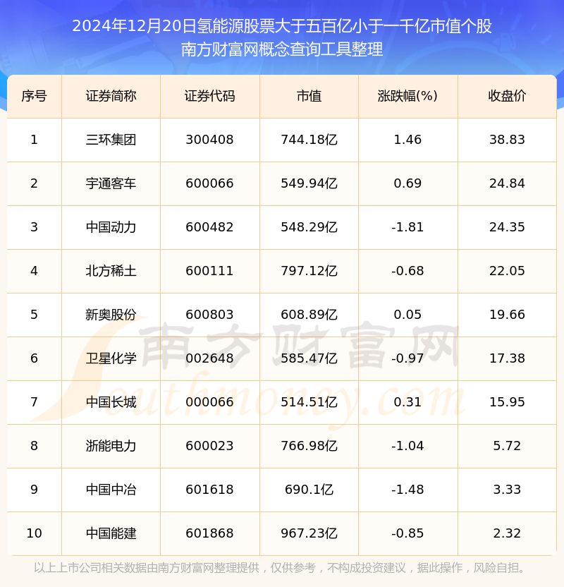 截止2024年12月20日,氢能源股票市值大于五百亿小于一千亿的个股共有10只。其中,市值较高的有中国能建、北方稀土、浙能电力,市值分别为967.23亿元、797.12亿元、766.98亿元。
