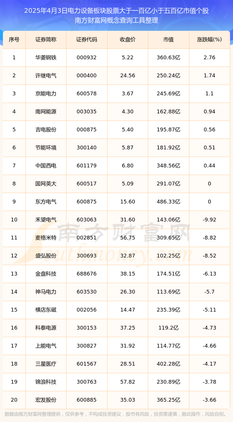 截止2025年4月3日,电力设备板块股票市值大于一百亿小于五百亿的个股共有57只。其中,市值较高的有东方电气、铜陵有色、晶盛机电,市值分别为486.33亿元、428.6亿元、414.34亿元。