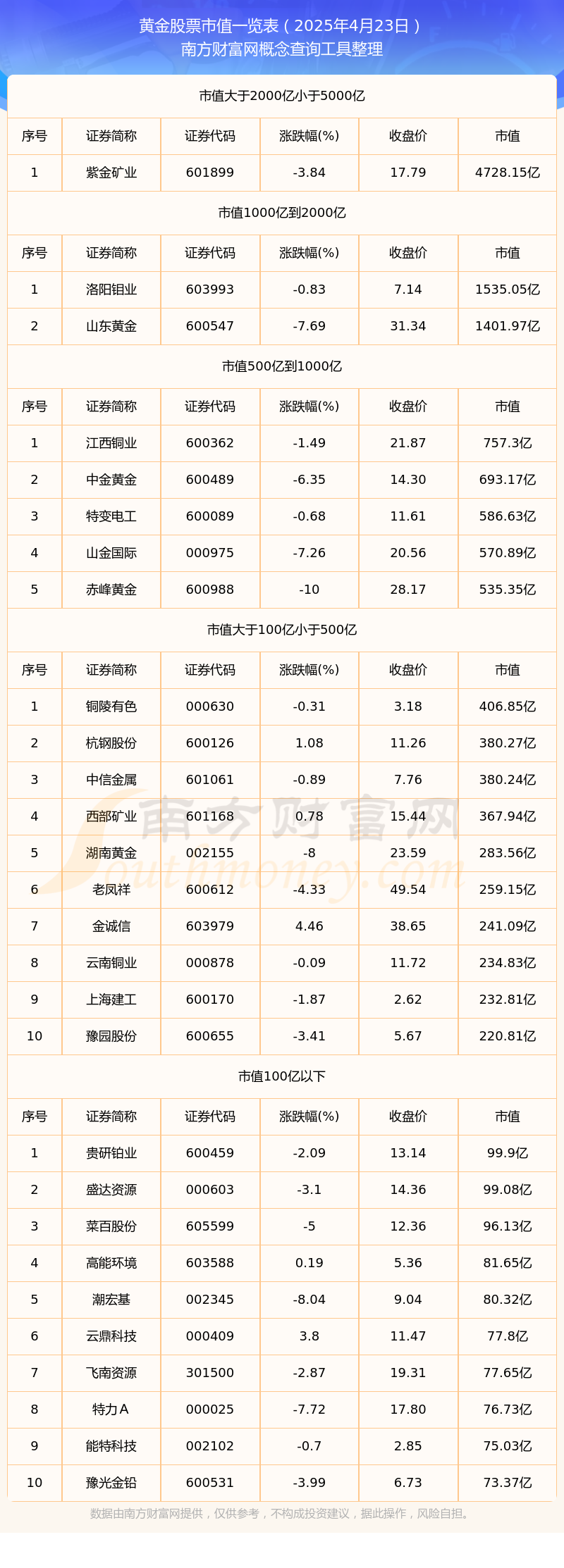 截止2025年4月23日,黄金股票中贵研铂业、潮宏基、飞南资源等27家市值位于不足100亿之列;铜陵有色、杭钢股份、西部矿业、湖南黄金、老凤祥等25家市值位于100亿到500亿之列;江西铜业、中金黄金、特变电工、山金国际、赤峰黄金等5家市值位于500亿到1000亿之列;洛阳钼业和山东黄金市值位于1000亿到2000亿之列;紫金矿业市值位于2000亿到5000亿之列。