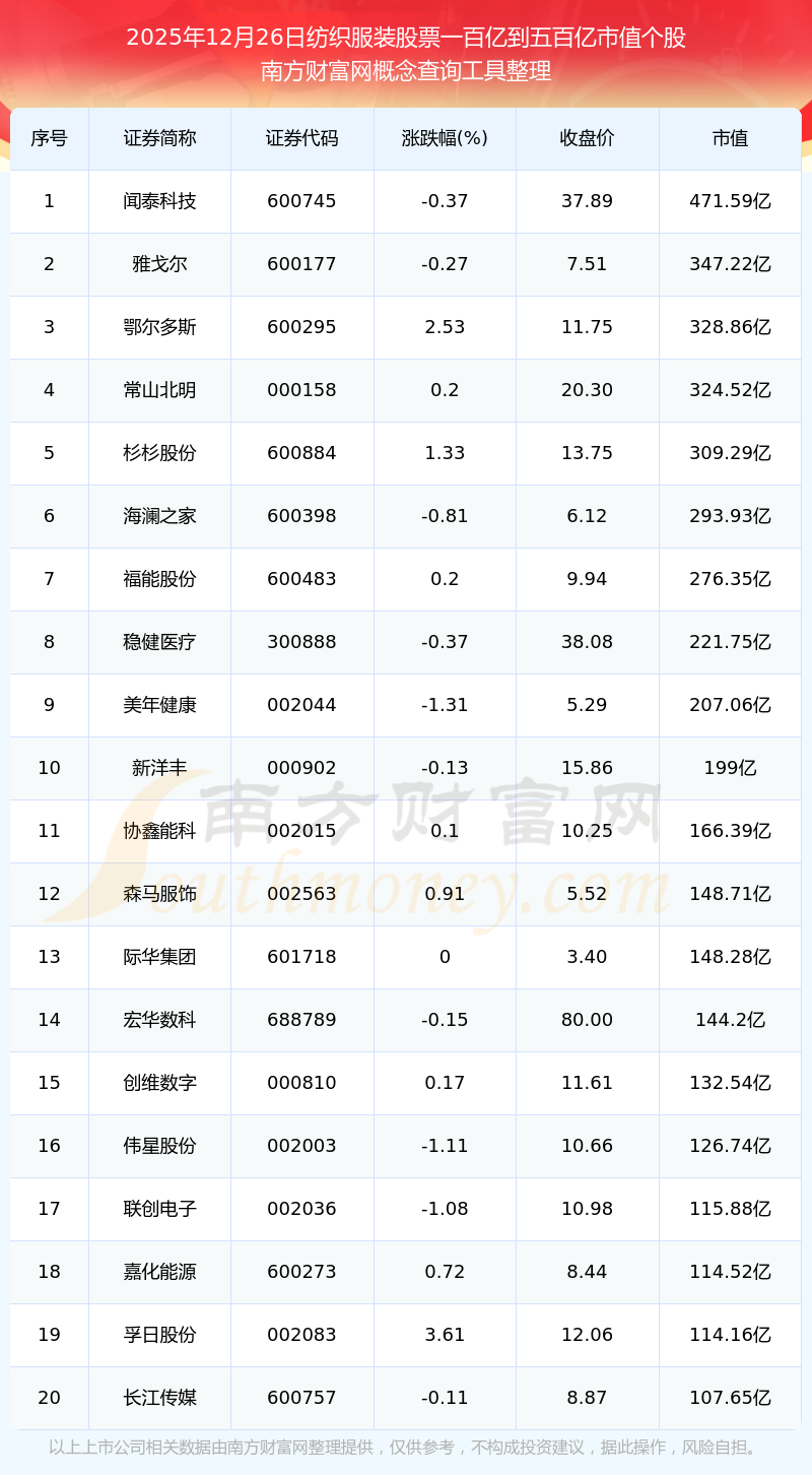 截止2025年12月26日,纺织服装股票市值一百亿到五百亿的个股共有20只。其中,市值较高的有闻泰科技、雅戈尔、鄂尔多斯,市值分别为471.59亿元、347.22亿元、328.86亿元。