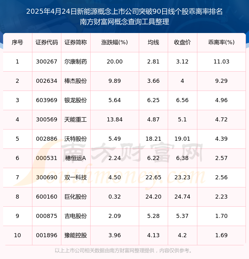 根据南方财富网概念查询工具数据统计,截止2025年4月24日收盘,新能源概念上市公司共有19只个股收盘价向上突破了90日线。其中乖离率较大的个股有尔康制药、棒杰股份、银龙股份等,乖离率分别为11.03%、9.29%、4.96%。