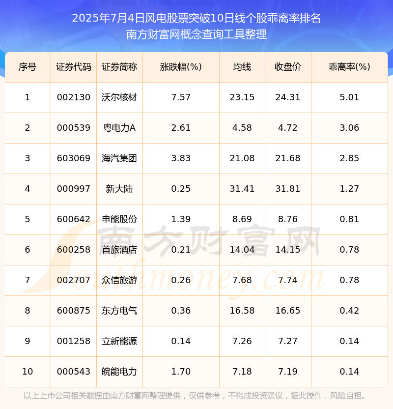 根据南方财富网概念查询工具数据统计,截止2025年7月4日收盘,风电股票共有10只个股收盘价向上突破了10日线。其中乖离率较大的个股有沃尔核材、粤电力A、海汽集团等,乖离率分别为5.01%、3.06%、2.85%。