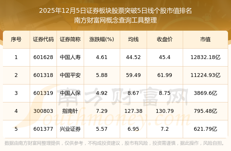 根据南方财富网概念查询工具数据统计,截止2025年12月5日收盘,证券板块股票共有5只个股收盘价向上突破了5日线。其中市值较大的个股有中国人寿、中国平安、中国人保等,市值分别为12832.18亿、11224.93亿、3869.6亿。