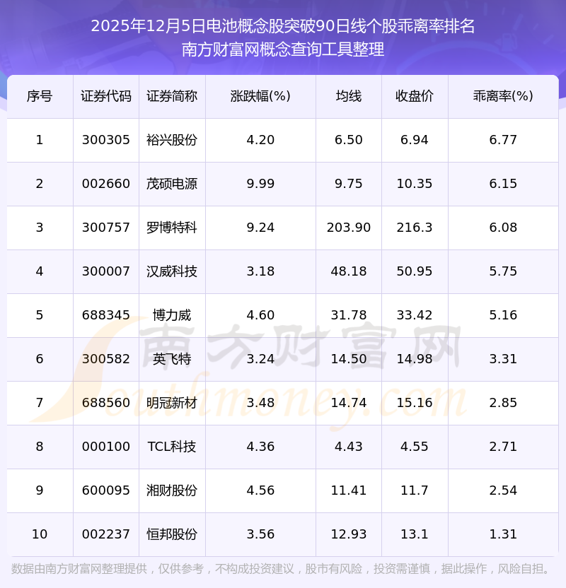 根据南方财富网概念查询工具数据统计,截止2025年12月5日收盘,电池概念股共有12只个股收盘价向上突破了90日线。其中乖离率较大的个股有裕兴股份、茂硕电源、罗博特科等,乖离率分别为6.77%、6.15%、6.08%。