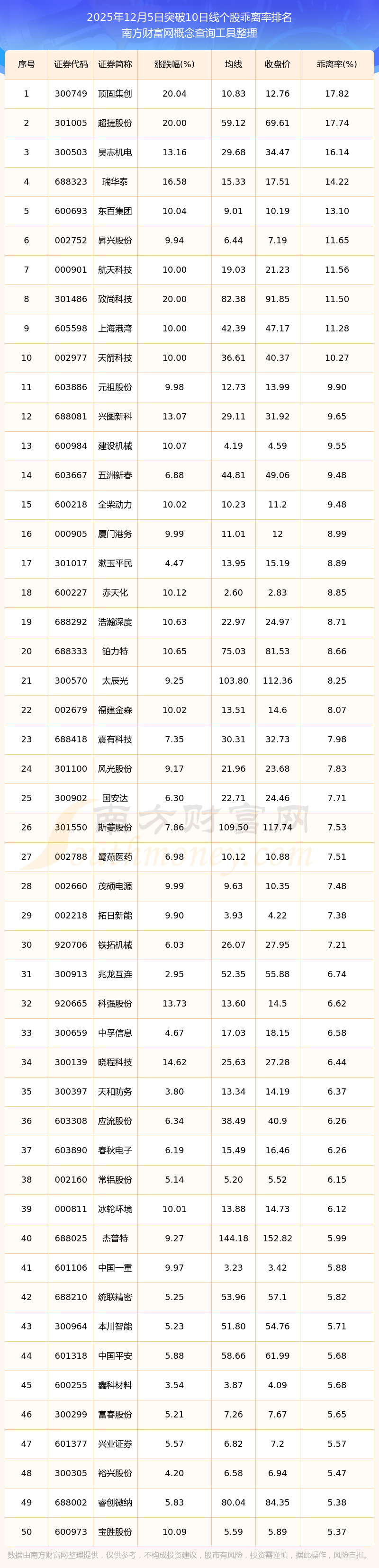 根据南方财富网概念查询工具数据统计,截止2025年12月5日收盘,共有218只个股收盘价向上突破了10日线,其中乖离率较大的个股有顶固集创、超捷股份、昊志机电、瑞华泰、东百集团等,乖离率分别为17.82%、17.74%、16.14%、14.22%、13.10%。