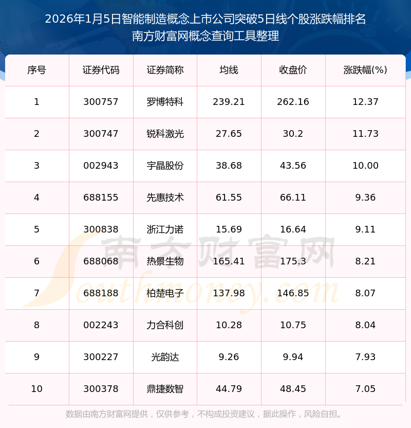 根据南方财富网概念查询工具数据统计,截止2026年1月5日收盘,智能制造概念上市公司共有169只个股收盘价向上突破了5日线。其中涨幅较大的个股有罗博特科、锐科激光、宇晶股份等,涨幅分别为12.37%、11.73%、10.00%。