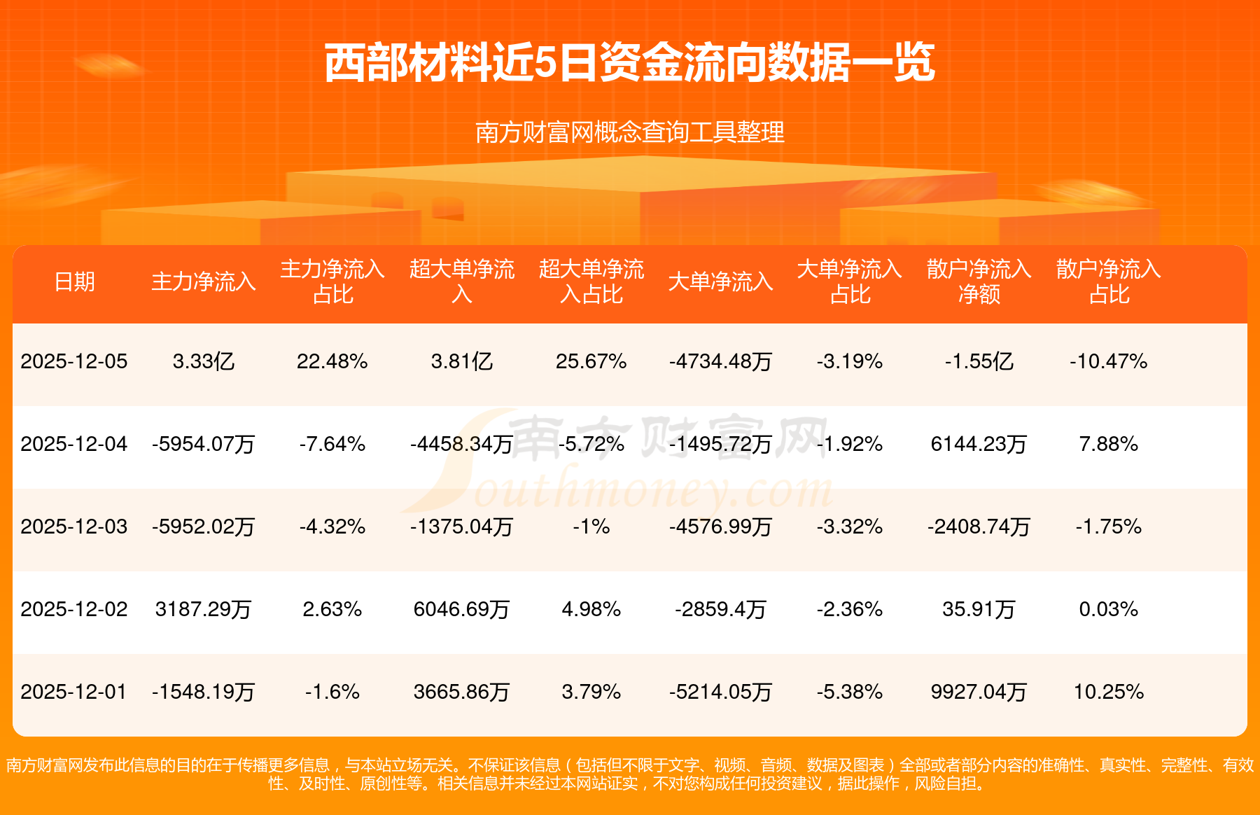 12月5日消息,西部材料资金净流入3.33亿元,超大单净流入3.81亿元,换手率15.32%,成交金额14.83亿元。