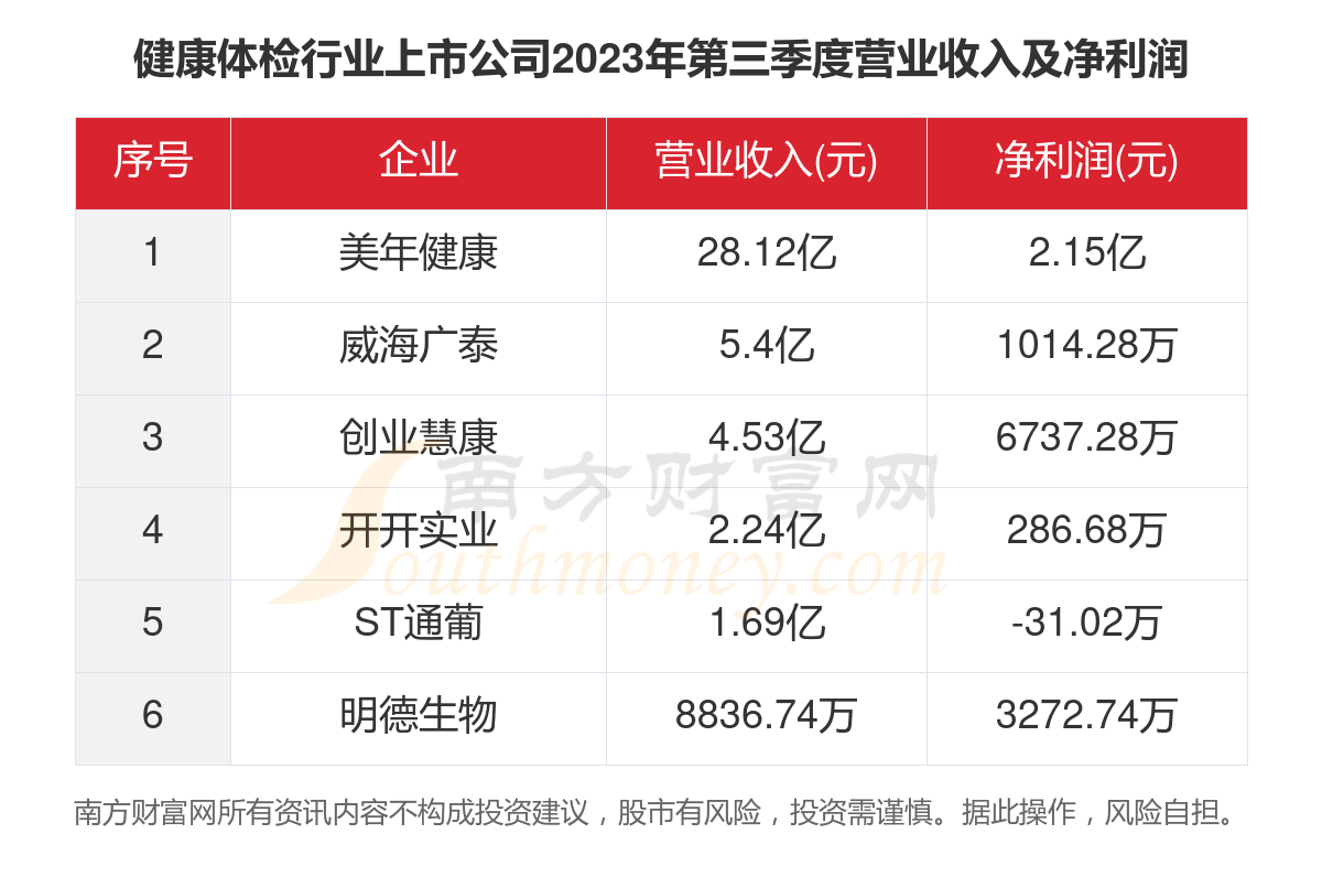 本文统计了A股6家健康体检行业上市公司的2023年前三季度的营业收入、净利润,2023年第三季度的营业收入、净利润,以及最新的市值情况。