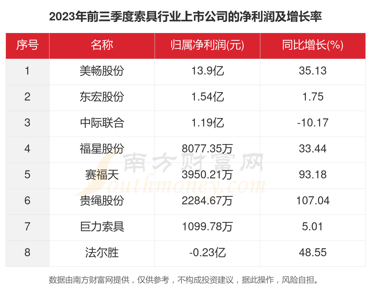 根据南方财富网概念查询工具数据统计,2023年前三季度,8家索具行业上市公司的2023年前三季度归属净利润合计为17.93亿元,同比增长30.9%。其中,2023年前三季度归属净利润前三的索具行业上市公司为:美畅股份、东宏股份、中际联合。