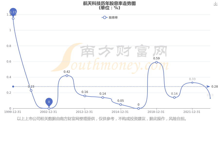 航天科技最新一次公布的分红方案为10派0.13元。本次权益分派股权登记日为2023年6月12日,除权除息日为2023年6月13日,派息日为2023年6月13日。