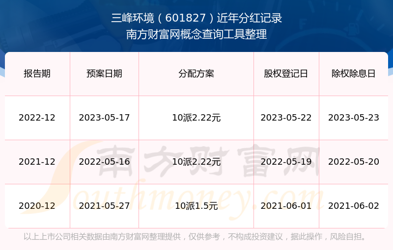 三峰环境最新一次公布的分红方案:10派2.22元。