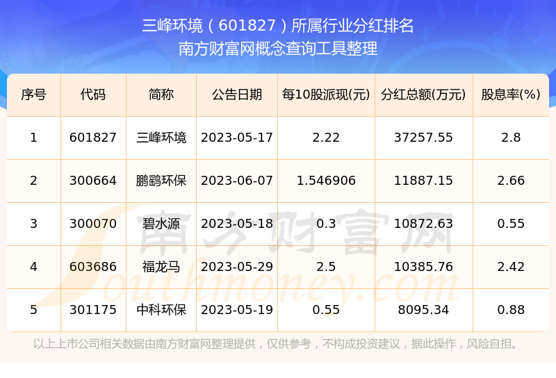 按照南方财富网趋势选股系统统计,三峰环境所属行业为环保行业行业,环保行业行业分红排名情况如下表: