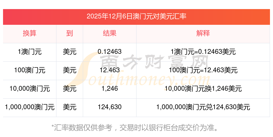 2025年12月6日汇率行情:47澳门元对美元汇率多少