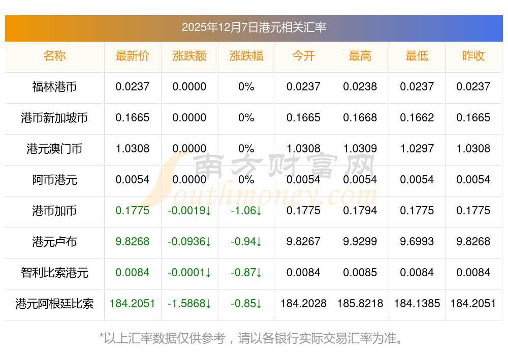 根据今天2025年12月7日汇率计算,HKD兑换NOK汇率最新价1.298500,今开价1.2985,昨收价1.2985,最高价1.3003,最低价1.2940。