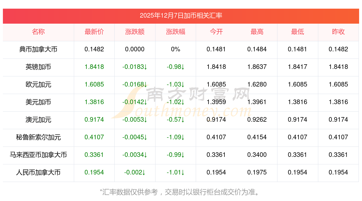 2025年12月7日加币相关汇率查询
