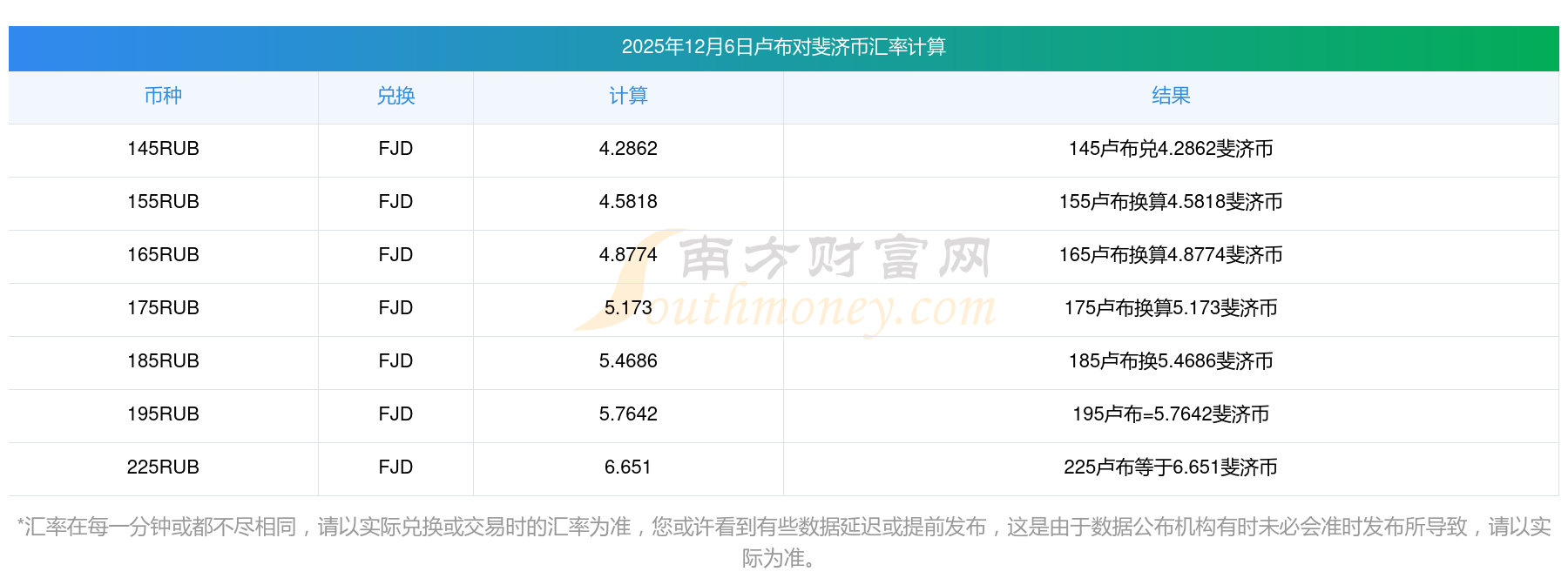 今天汇率更新!2025年12月6日98卢布兑换斐济币是多少?