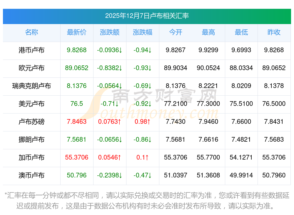 2025年12月7日卢布相关汇率查询
