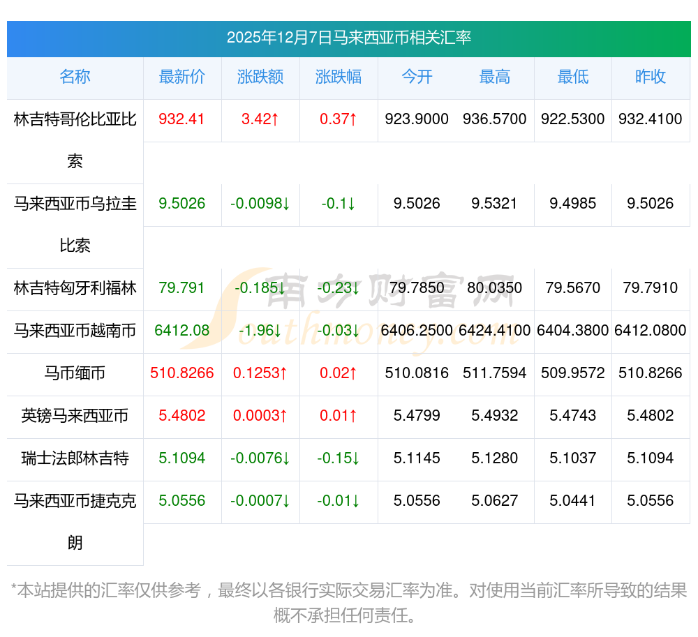 根据2025年12月7日汇率计算,MYR兑换CAD汇率最新价0.336080,今开价0.3361,昨收价0.3361,最高价0.3400,最低价0.3361。
