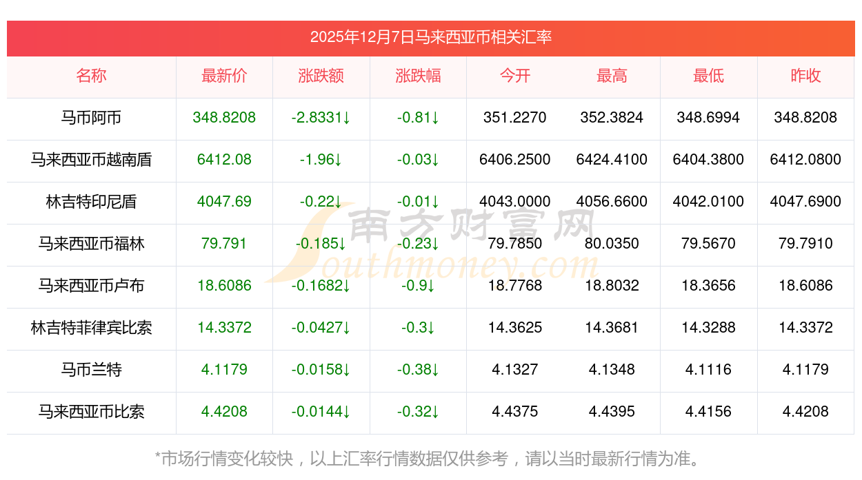 根据2025年12月7日汇率,马来西亚币兑换福林汇率最新价79.791000,今开价79.7850,昨收价79.7910,最高价80.0350,最低价79.5670。