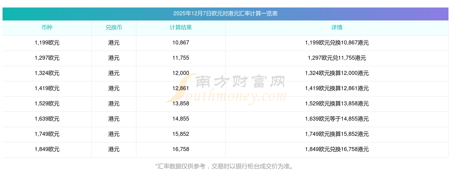 南方财富网为您提供欧元对港元汇率最新价格详情。