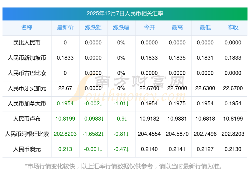 根据2025年12月7日汇率,人民币兑换比索汇率最新2.570470,今开2.5803,昨收2.5705,最高2.5803,最低2.5674。