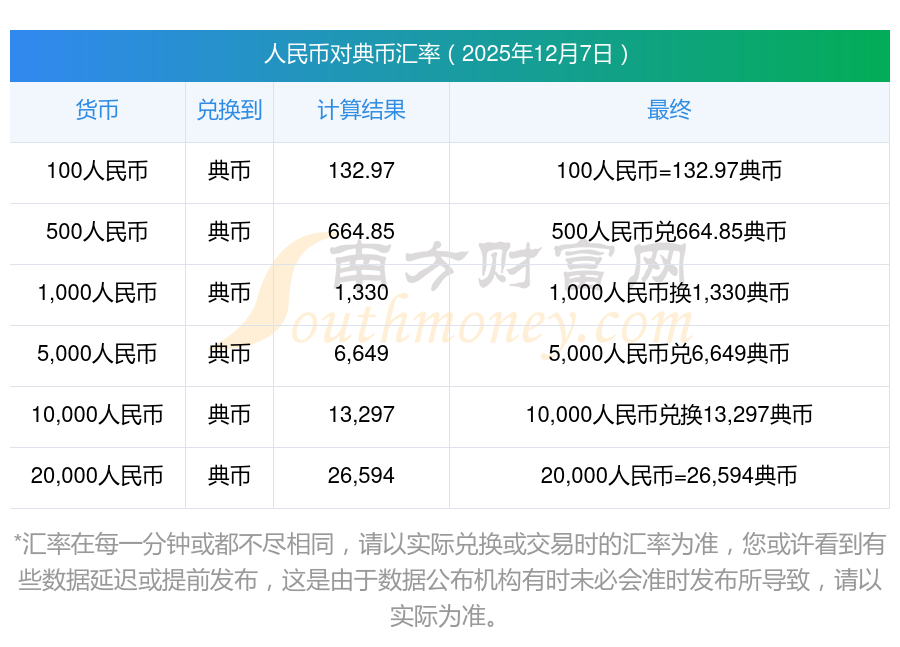 南方财富网为您提供人民币对典币汇率最新价格详情。