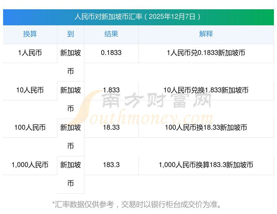 今日汇价查询:2025年12月7日40人民币兑新加坡币汇价一览