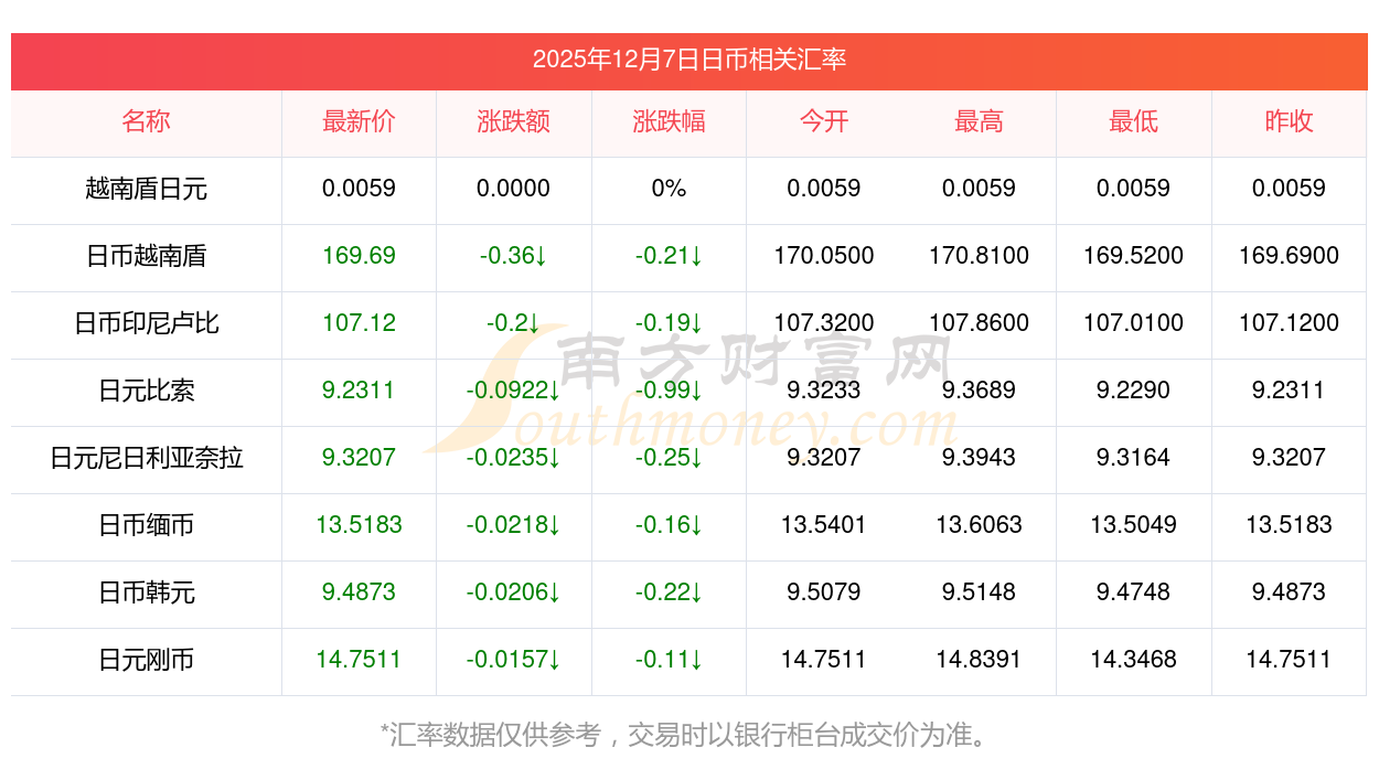 2025年12月7日日币相关汇率查询