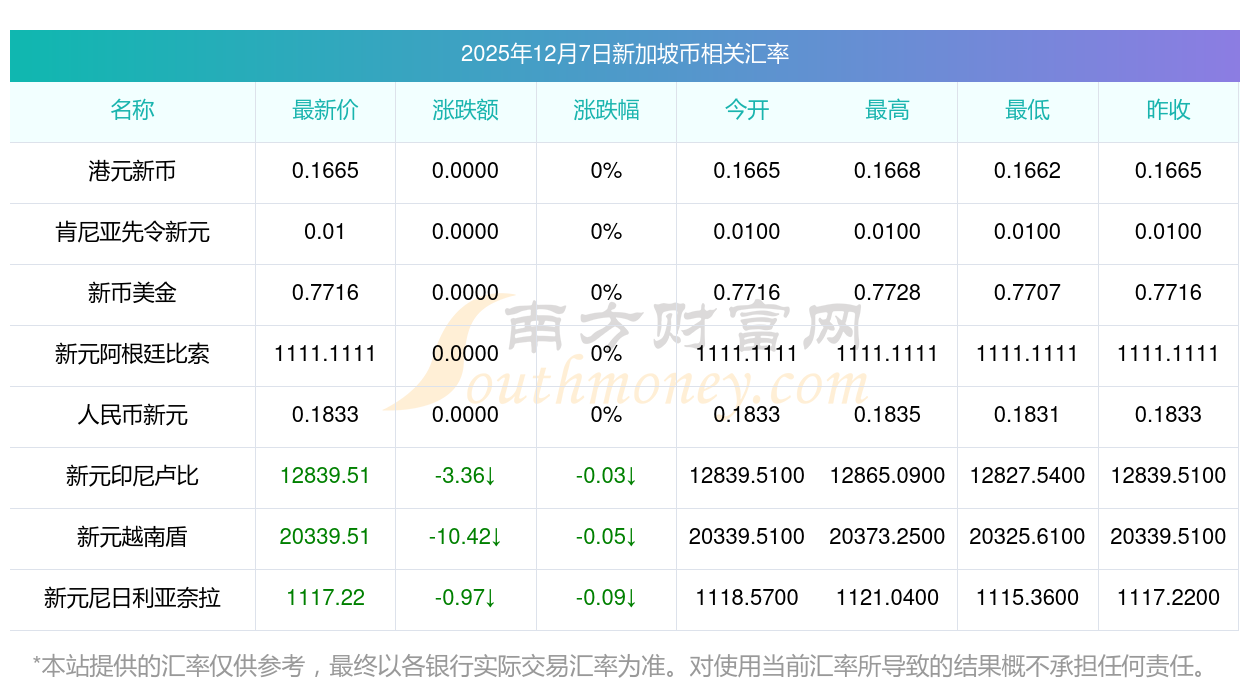 根据今天2025年12月7日汇率计算,SGD兑换NOK汇率最新价7.799700,今开价7.7997,昨收价7.7997,最高价7.8110,最低价7.7811。