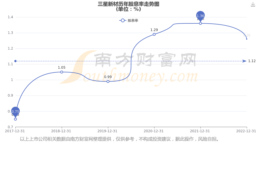 三星新材最新一次公布的分红方案为10派1.8元。本次权益分派股权登记日为2023年5月18日,除权除息日为2023年5月19日,派息日为2023年5月19日。