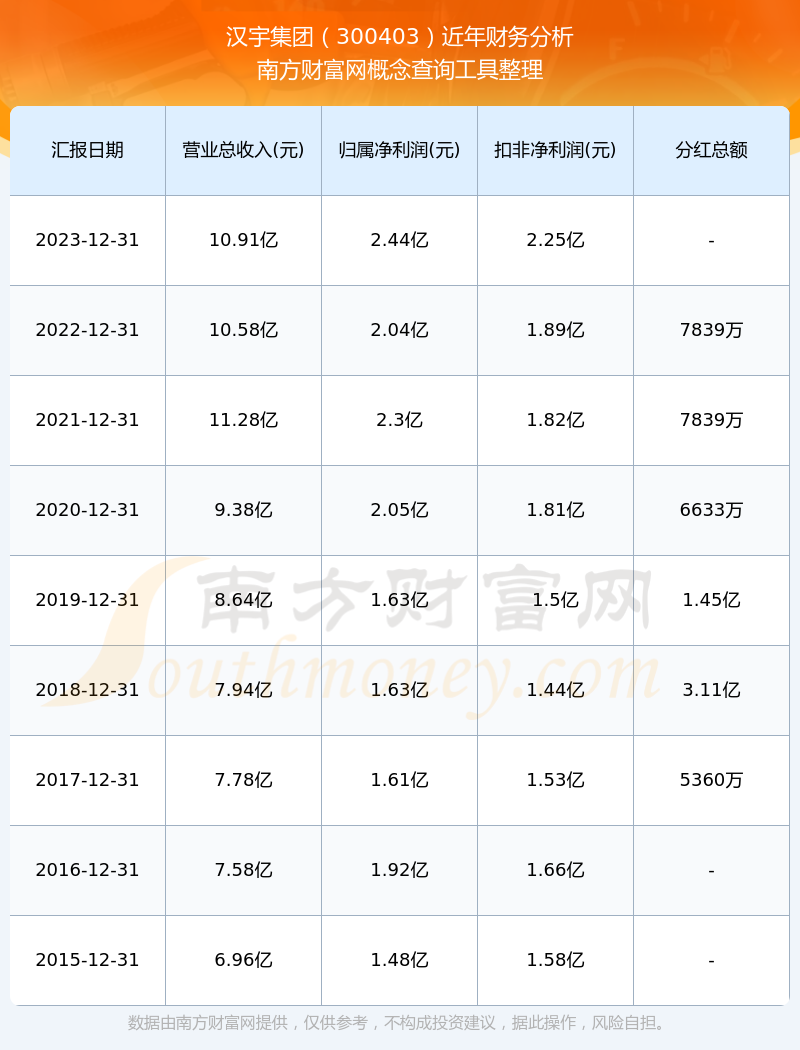 2023年汉宇集团总营收10.91亿,同比增长3.2%;净利润2.44亿,同比增长19.48%;销售毛利率34.18%。