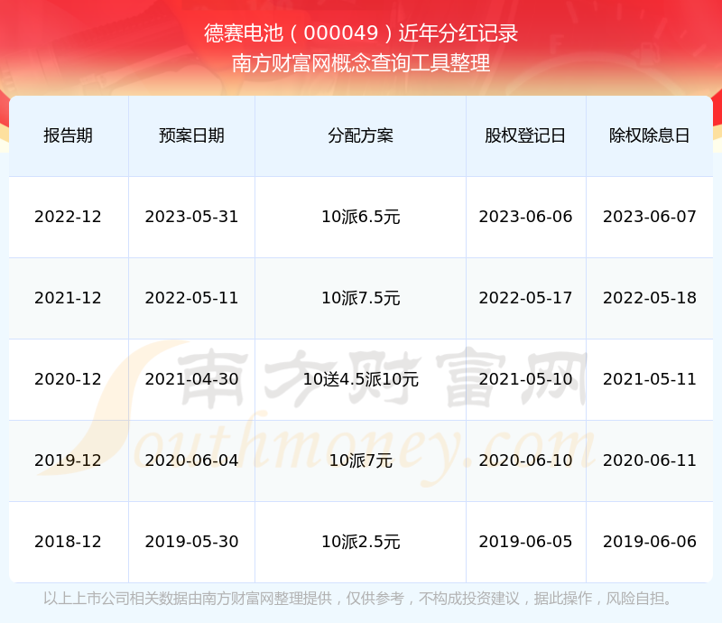 德赛电池最新一次公布的分红方案:10派6.5元。