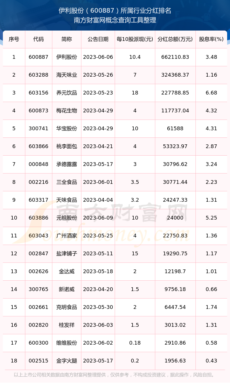 按照南方财富网趋势选股系统统计,伊利股份所属行业为食品饮料行业,食品饮料行业分红排名情况如下表: