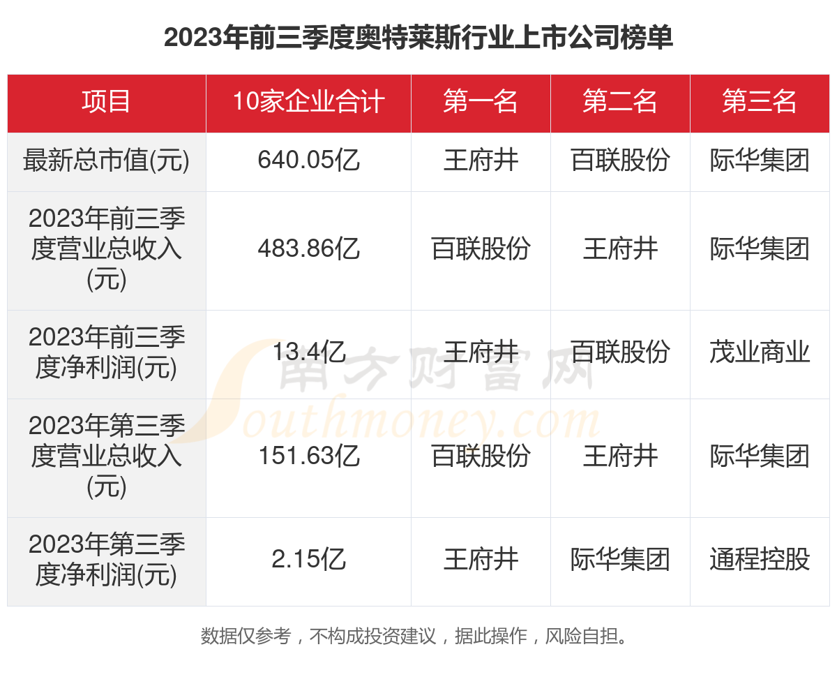 根据南方财富网概念查询工具数据统计,2023年第三季度,A股10家奥特莱斯行业上市公司的季度营业收入合计为151.63亿元,净利润合计为2.15亿元。