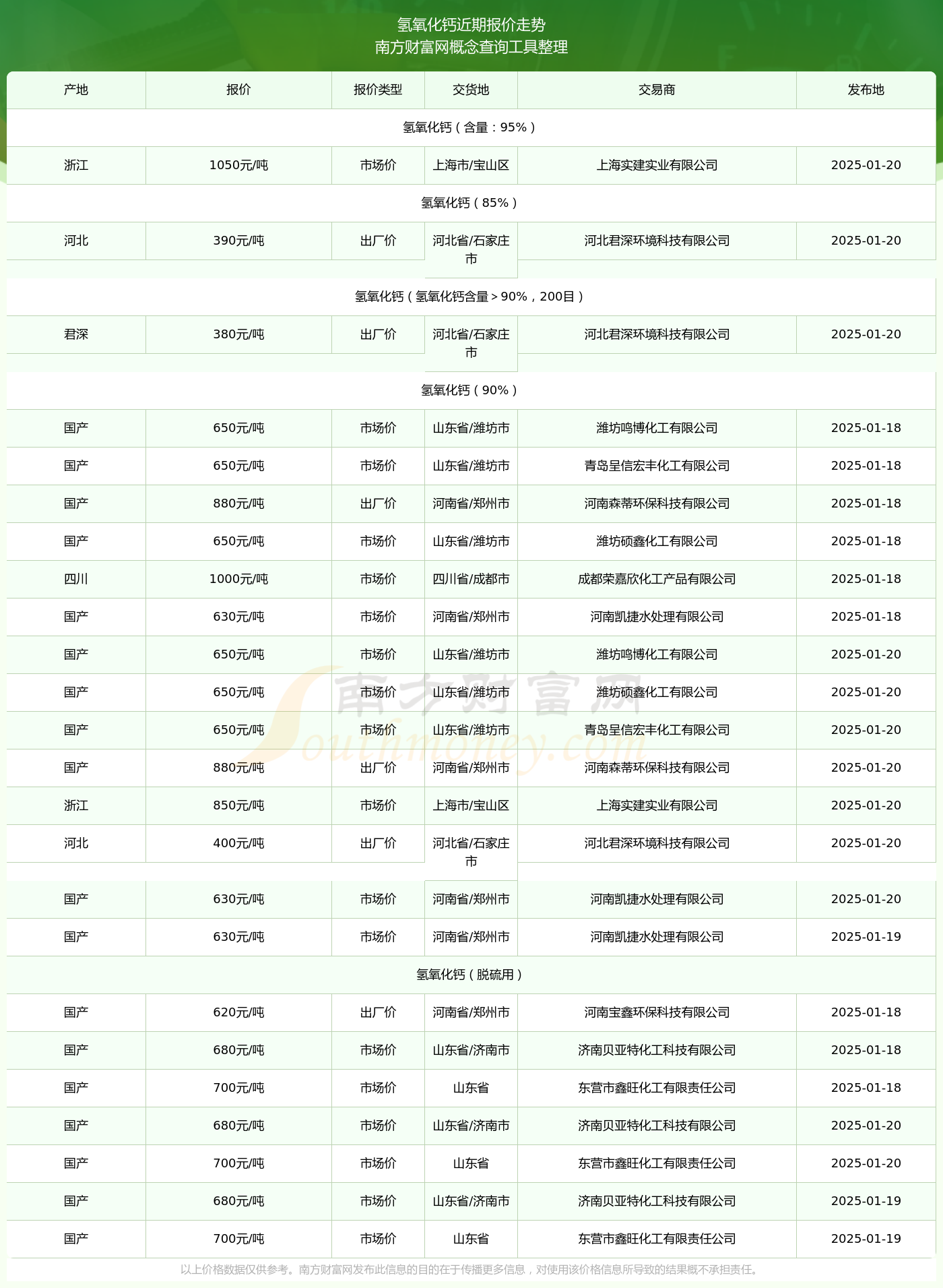 2025年1月20日,青岛呈信宏丰化工有限公司氢氧化钙(90%),国产,交易地点为山东省/潍坊市,报价为650.00元/吨。