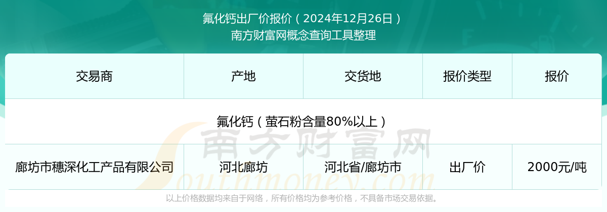 2024年12月26日,氟化钙(萤石粉含量80%以上)出厂价价格为2000.00元/吨,报价人:廊坊市穗深化工产品有限公司,交易地点为河北省/廊坊市。