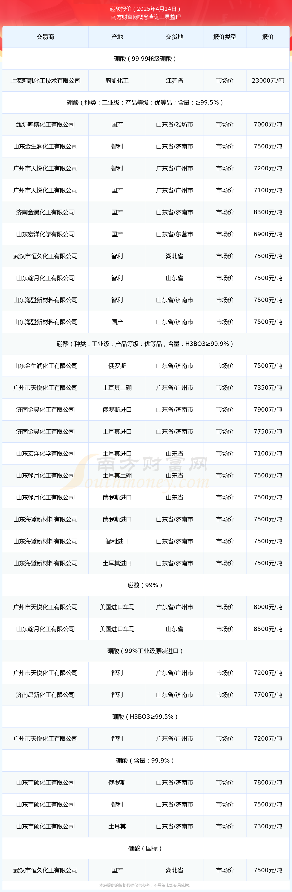 硼酸报价:2025年4月14日硼酸多少钱